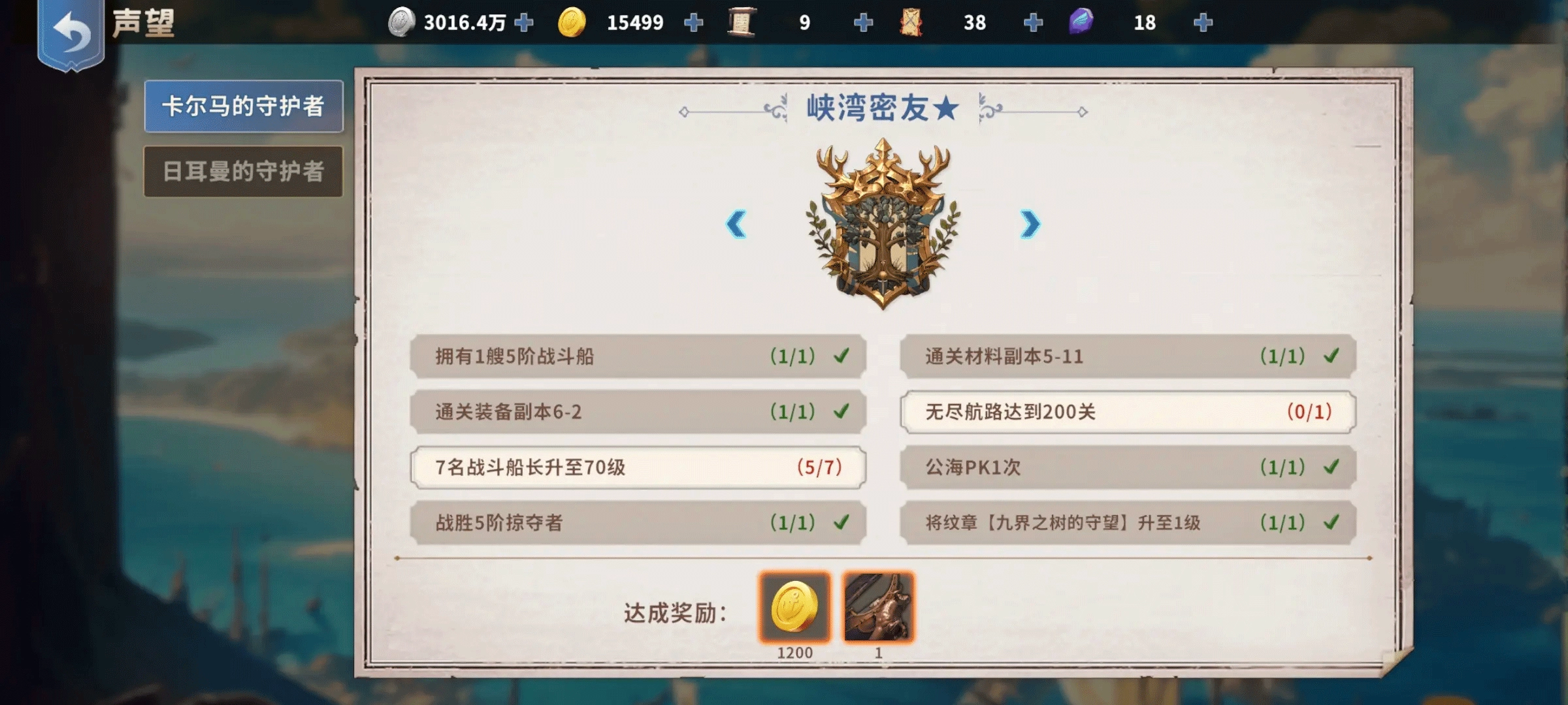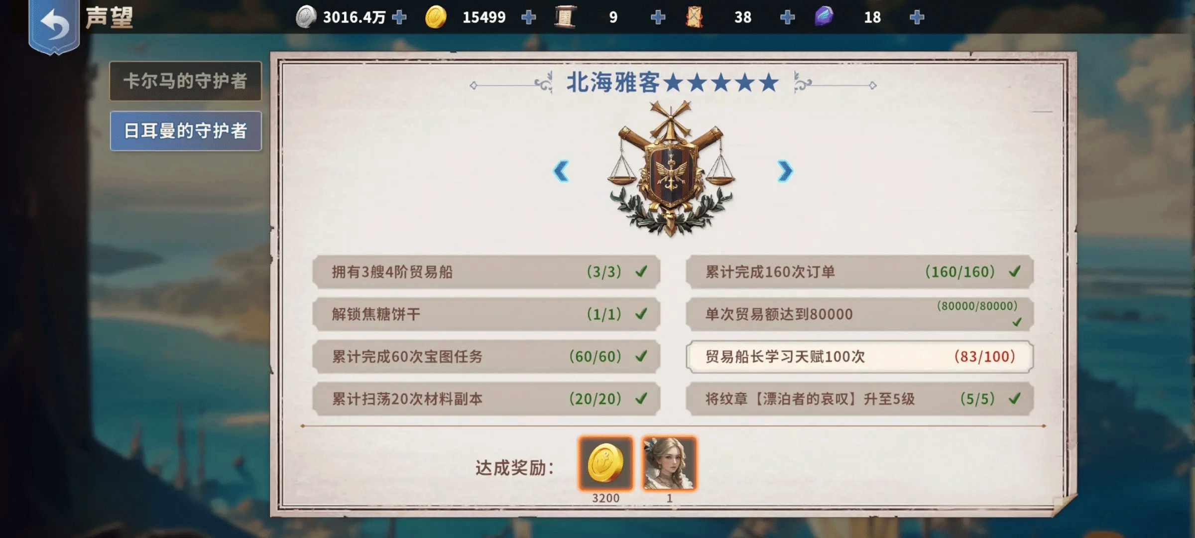 3、单线贸易问题:橙色货物阶段前,一般跑双边贸易。当两边都开启首个橙色货物后,你的船只与贸易船长想必已具备一定实力。此时,可在马卡尔与日耳曼这两条路线中择其一进行单边贸易,如此能以最快速度获取金色货物材料。要是每天刷30次都不出想要的货物,还能转而跑另一边的橙色货物,这不是一举两得嘛。马卡尔的声望任务奖励是雷利以及一套类似商城售价648的金装;日耳曼的贸易单价略高,其声望奖励为载重藏品与卢克,后续奖励可通过声望任务的左右箭头查看。大家可依据自身发展进度与个人喜好来做出选择。