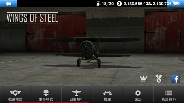 1、首先打开钢铁之翼最新版,点击进入游戏可以看到三种模式:战役模式、生存和自由飞行,点击机库可以更换飞机;