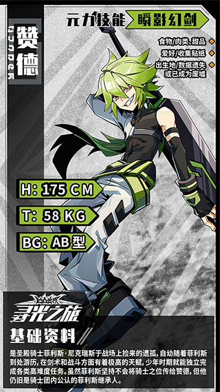 ,是圣殿骑士菲利斯·尼克瑞斯于战场上捡来的遗孤,自幼随着菲利斯到处游历,在剑术和战斗方面有着极高的天赋,少年时期就能独立完成各类高难度任务。虽然菲利斯坚持不会将骑士之位传给赞德