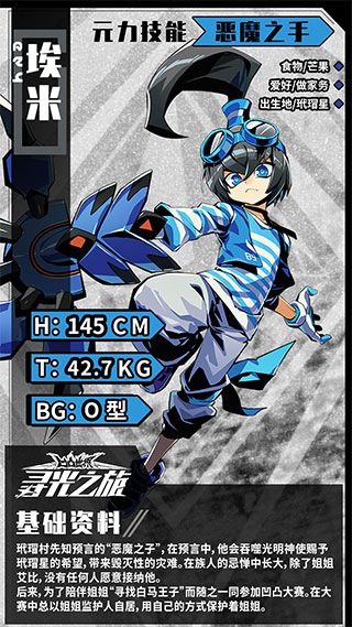 ,玳瑁村先知预言的“恶魔之子”,在预言中,他会吞噬光明神使赐予玳瑁星的希望,带来毁灭性的灾难。在族人的忌惮中长大,除了姐姐艾比