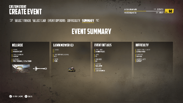 2、进入自定义比赛,把地图选定为HELLRIDE,设定对手数量为23个,且全部设定为割草机LAWN MOWER,将圈数设为60,对手AI设置为expert。你自己的车辆既可以选择割草机(使用割草机1小时可获得奖杯),也能选择其他强度非常低、极易撞毁的车。