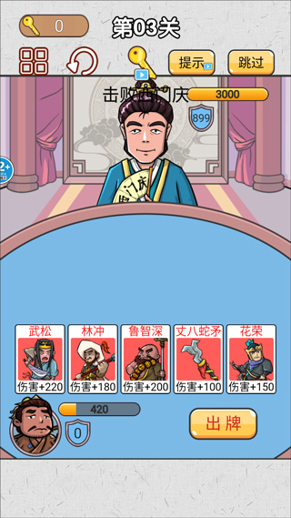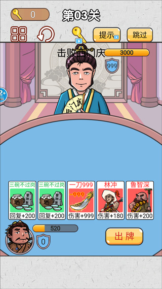 4、不同的卡牌,拥有不同的组合,如铁戒刀+武松可以合成一刀999