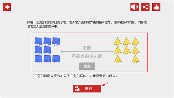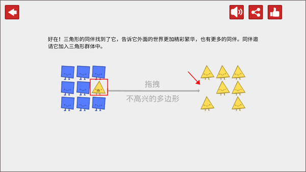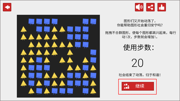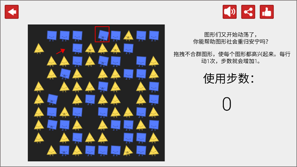 3、图形们因为身边其他图形的不高兴而导致图形社会动荡,拖拽不合群图形,使每个图形都高兴起来。每个图形移动1次,步数就会增加1。