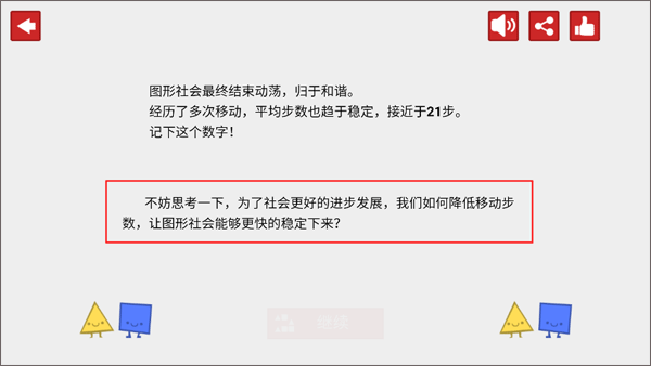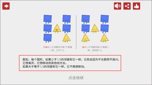 2、按照游戏规则说明:若每个图形的邻居中,与它相同的数量少于三分之一,它便会因不合群而感到不悦。此时它会萌生离开的想法,想要迁移到别的地方。而要是邻居中与它相同的数量大于或等于三分之一,它就不再有移动的念头。