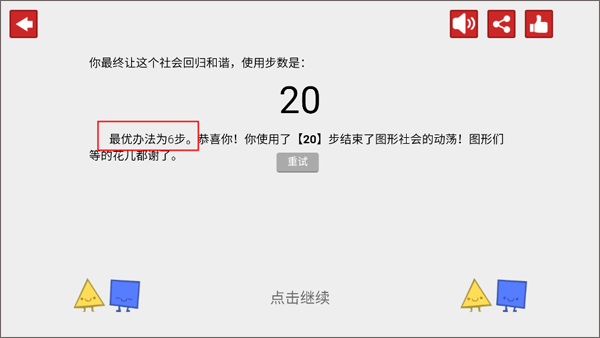 4、当你发现,要让图形社会恢复安宁,需要走非常多的步数时,就会察觉到图形们已然等得失去耐心。而达成这一目标的最优步数是6步,因此,你得用最少的步数让图形们安静下来。