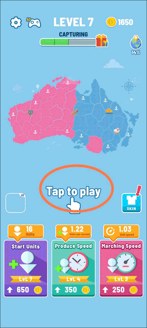 进入游戏后,点击即可看到一个很大的地图,屏幕正中间有一句话“tap to play”,点击它游戏便开始。这句话下方有三项内容,分别是部队的生成时间、速度以及数量,后续可通过花费金币升级的方式,增强这三项能力。