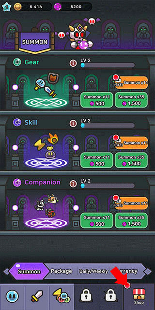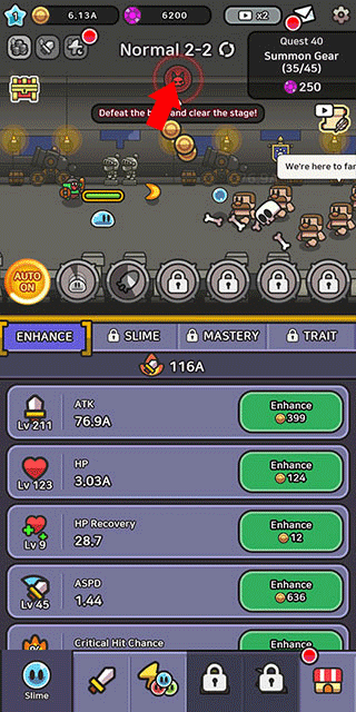 4、接着点击召唤按钮,就能抽取并升级我们的武器。要是任务失败,也无需担忧,只需把它放在那挂机,升级史莱姆的属性就行。