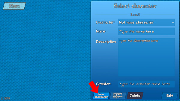 2、进入下图所示界面后,点击下方的“New character”创建新角色(也可通过“Import/Export”进行角色的导入/导出操作)。