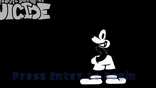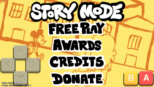 1. 启动《Sunday Night Suicide》游戏后,首先映入眼帘的是一只灰色的米老鼠形象。轻点屏幕,即可进入主界面。主界面中,左边设置有上下左右方向键,右边则是返回键与确认键。玩家可通过点击上下键,来挑选中间呈现的功能选项。