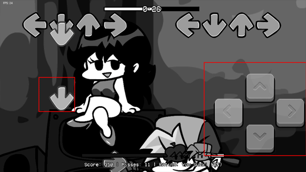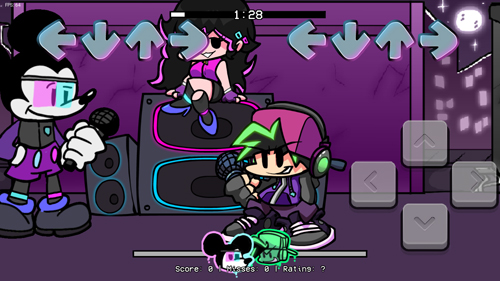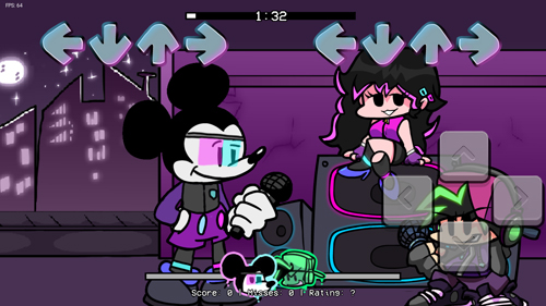 周五夜放克的米老鼠合集模组(Mouse MegaMix)包含开心米老鼠、悲伤米老鼠等多个不同角色,同时该游戏增添了许多新歌曲。在游玩这个模组时,我们要依据音乐节拍,点击屏幕上出现的上下左右键。