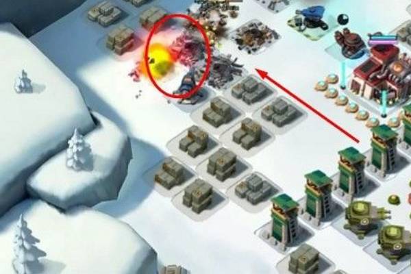 2、对于防守野人来说,大本附近短距离攻击必不可少,其次就是地雷,尽量在每个可能的路线上放上地雷,不用太密集,因为地雷有限,尽量不要给对手一条平坦大路。像这个阵型,无损到本,起码要丢两个多管,或者绕路,消耗多个烟雾和引导,都可以达到浪费能量的目的。这样尽可能的让对方少丢出震爆。这个阵型防野人还是有效果的。