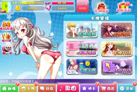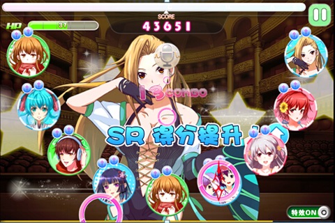 系统提供了大量歌曲供玩家选择演奏,歌曲会随着等级的提升或者VIP特权而解锁。每首歌曲都划分成从简单到困难的三个级别,并且歌曲具备特定属性,这些属性与卡牌的三围属性相互对应。歌曲的得分仅和与歌曲属性相同的队伍卡牌属性值相关,玩家选择助阵好友能够提升队伍属性。