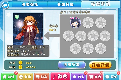 技能升级方式:以相同的技能卡牌或技能卡作为主卡进行技能升级操作,以此提高技能的触发概率与触发效果。不过,技能升级存在一定的成功几率。