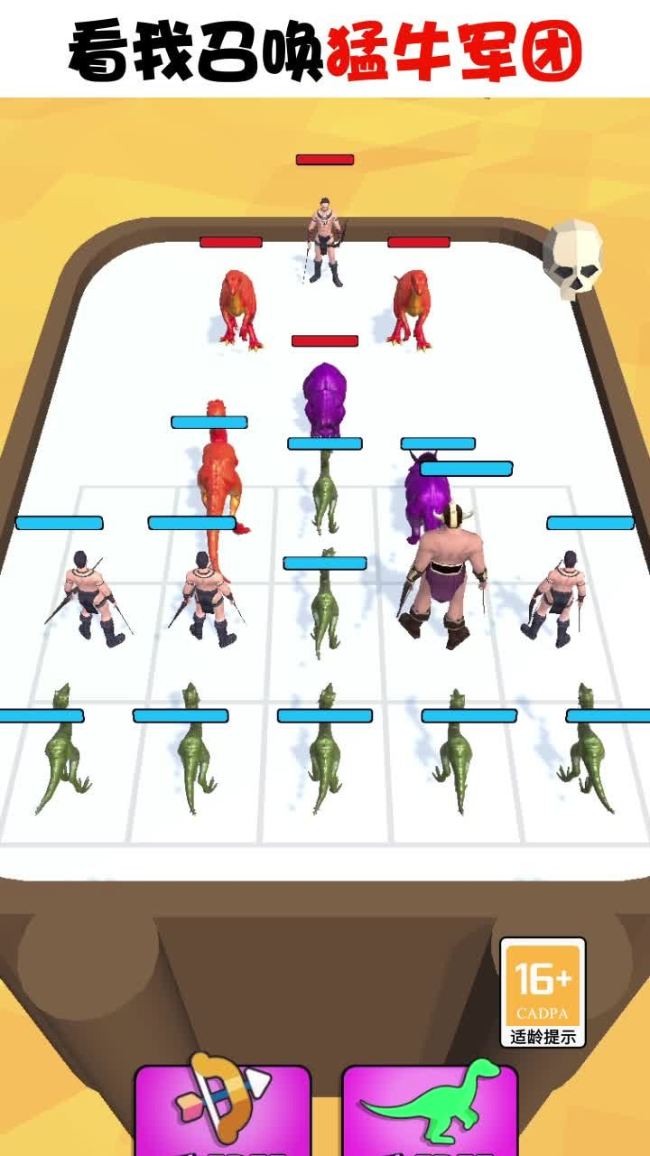 合体对决,这是一款休闲类的合成对战小游戏。在此游戏中,双方展开热血对决,对战的每一方都拥有各式各样不同的恐龙、勇士等角色。只要合成相同的角色,就能实现角色升级,进而在对战敌方时获取更大的胜利。