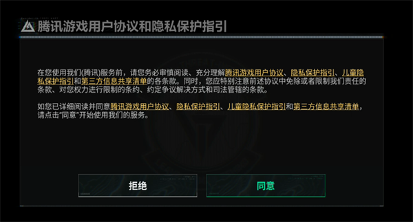 1、打开三角洲行动手游中文版,同意腾讯游戏用户协议和隐私保护指引,
