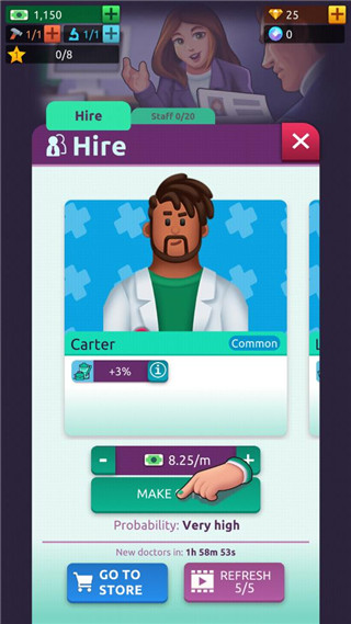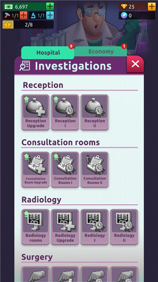 3、升级系统:游戏中设有丰富的升级系统,玩家可以升级医院、设备和员工,提升医院的科技水平和服务质量;