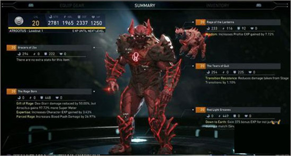 游戏中有成百上千种物品可以获取,每项物品的影响能力也不同。除了对角色属性的影响外,还有一些稀有装备有一些特殊效果,比如 新的视觉特效,或者增加每场战斗中获得金币数量等。如果能够收集到完整的一整套装备,还会得到额外的增益,比如增加蝙蝠侠蝙蝠镖的射程。