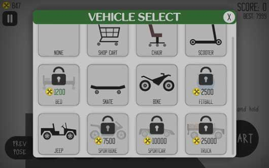 至于BUG就是那三个螺旋桨的地图,让小人坐在购物车里面,蓄力让购物车前进,被第一个螺旋桨击中,会让小人的肢体卡在购物篮里,然后不停骨折,但是不太稳定,小人挣扎的时候,会翻跟斗让购物车甩飞,实验了几百次,大概只有十几次会让小人不停得挣扎,最少会得十几万分,运气好会得五十万以上。当然有时候用卡车什么的也会被卡住骨折,或者被螺旋桨卡住骨折,分数高到吓人,就是停不下来,无法保存。