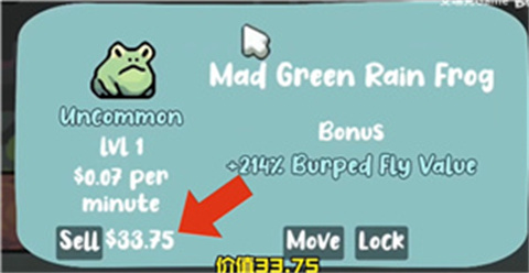 6、此刻有一只极为稀有的疯狂绿雨蛙,价值33.75 。挺不错的,当初花10块钱买下,如今能卖到原价3倍的价格。由于这只蛙刚才吃了几只金色苍蝇,所以赚的钱足够再买两只蛙。