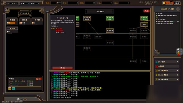 8、每次击杀散人并完成任务后,前期都会获得武学经验。这时,打开人物属性 - 武功 - 修炼,用这些经验来升级你的武学内功。基础内功和基础剑法,对你后续能否学好武功起着关键作用,多提升一下并无坏处。升级完成后,安排好门派相关事宜,你就能够安心去做主线任务了。(右下角的门派选项,可随时用于调整门派任务的摊派。)