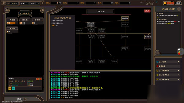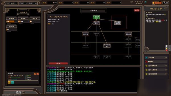 2、刚开局没什么钱和材料,开完门派荒地后,先别建厢房,工坊(基础材料加工厂),百宝阁(锄头铁毡工具之类),农田(拿种子种粮食药),大殿弄好,然后分派两个人分别去后山森林,矿场,砍树挖石头,这样材料来的快点。
