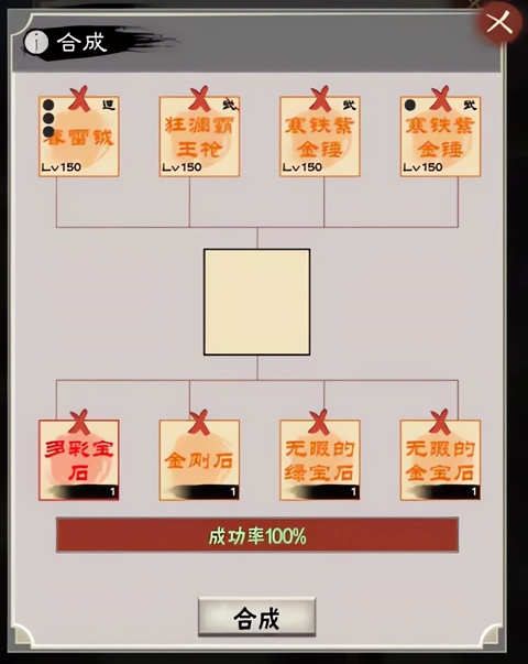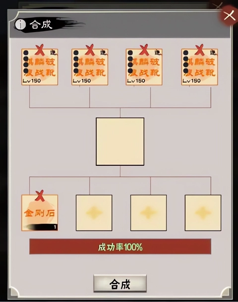 这是合成系统里最基础的一种玩法:先在第一行栏位放入任意4件装备(坐骑类装备不能放),然后点击合成按钮,系统就会从这4件装备里随机选出一件作为合成结果。需要注意的是,装备品质越高,被选中的概率就越低,但装备本身的品质是固定不变的,像方天画戟这类装备就始终是橙色品质。另外,合成得到的新装备,它的孔数也是随机生成的,有可能出现4孔,也可能是5孔。