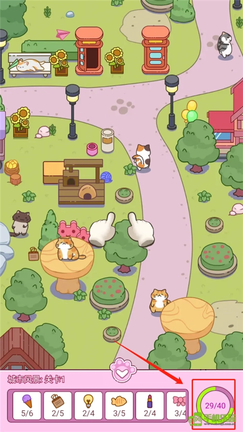 玩家需在动态场景中寻找隐藏的猫猫宝藏,每个关卡包含数十个小物品,后期需组合或排除干扰项(如大小不符的相似物品)。