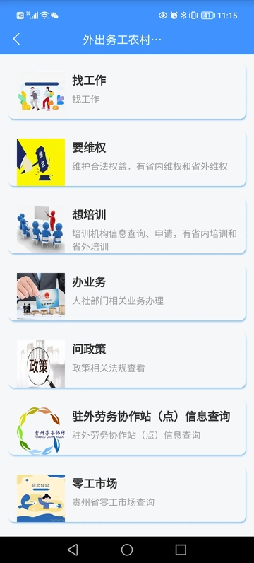4. 进入页面后,可对应查询“找工作、要维权、想培训、办业务、问政策、驻外劳务协作站(点)信息查询”等服务事项。1. 于本站进行“贵州人社”APP的下载与安装。