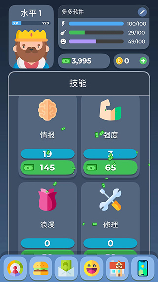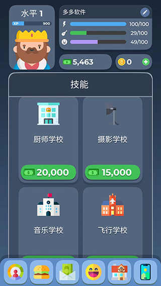 6、游戏中除了工作以外,还可以学习技能,当拥有的技能后,我们赚钱的能力就更强,这时点击前面赚钱按钮就能获得更多的金钱奖励。不过学习也是非常消耗体力、心情、饥饿值的,所以玩家们需要在较为饱和的状况下去学习,