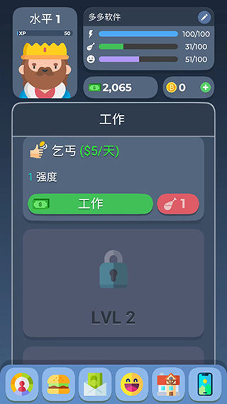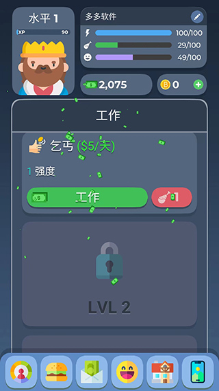 2、我们要通过赚钱来提供自己更好的生活,养活自己。直接点击屏幕下方“工作”的条目即可获得金钱,不过在金钱数量增加的同时,体力值、心情值、饥饿值都会有较快的下降,