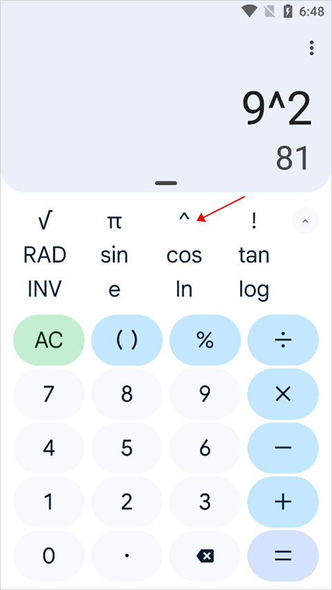 例如求9的平方可以点击指数键(下图红色箭头所指)