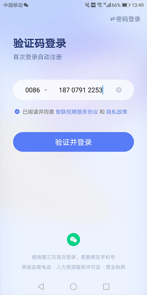 2、在打开的新页面中输入手机号并勾选服务协议,使用手机验证进行登录,或点击页面底部的微信图标,进行微信账号授权登录