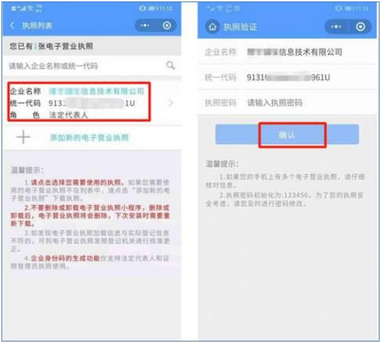 2、进入微信电子营业执照小程序列表页面,并显示客户已领取的电子营业执照,点击执照信息,执照验证页面核对企业信息、输入执照密码后,点击“确认”;