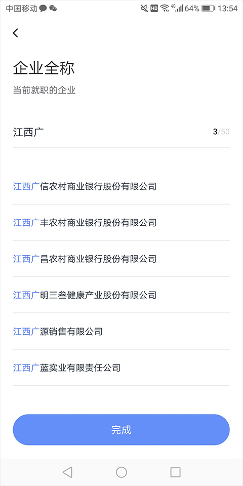 4、在企业名称认证页面中,用户需要输入公司的全称,即工商营业执照上的公司名称,不可输入简称,在输入的过程中,软件可以调取工商管理部门的信息库进行公司匹配
