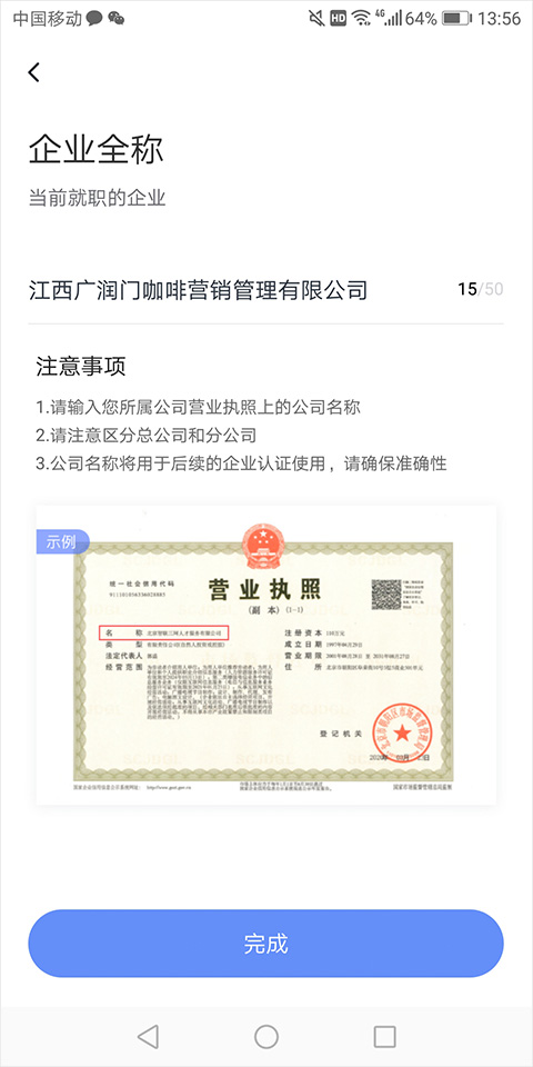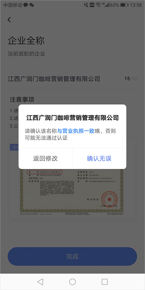 注意:务必不要点击页面中的“返回”按钮!!!执照认证成功后,请您直接打开智联招聘 APP;
