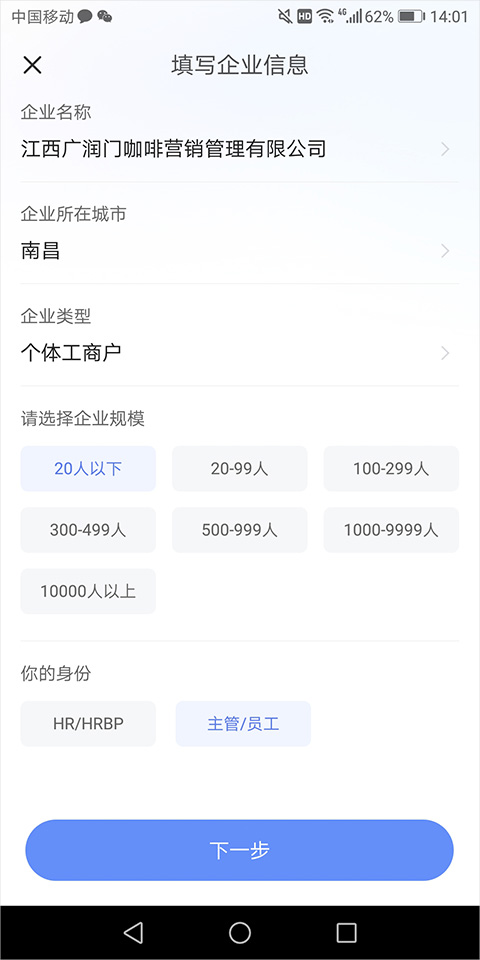 5、输入完公司名称后,在打开的新页面中按页面提示,依次选择企业所在城市,企业类型,企业规模,以及本人身份后点击【下一步】
