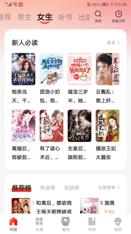 2、在书城界面,有推荐、男生、女生和听书等分类,我们可以选择自己感兴趣的分类,