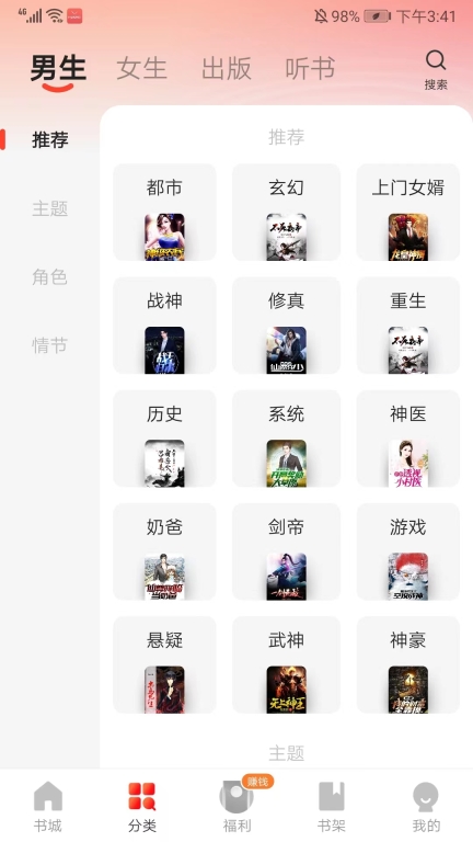 7、进入分类界面,包括推荐、主题、角色、情节等不同的类别,