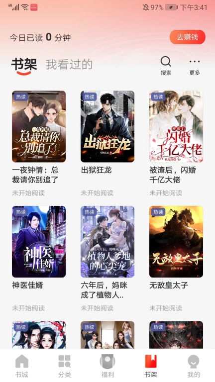 9、进入书架界面,可以快速打开自己想要阅读的书籍和查看自己已经看过的书籍,