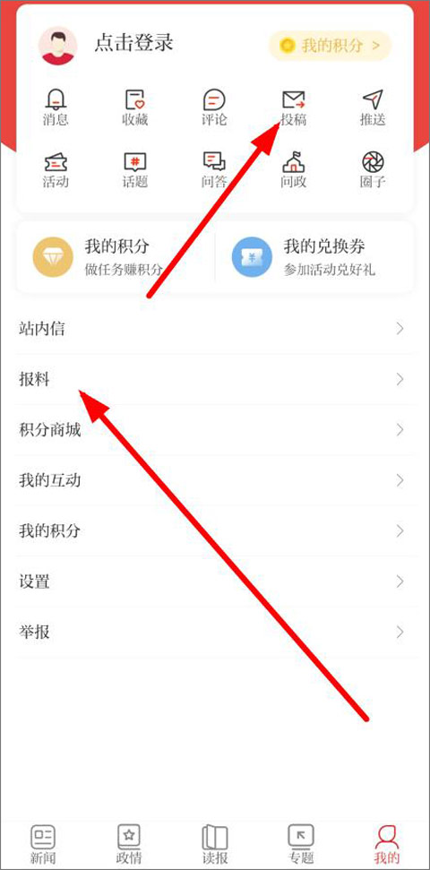 2、用户中心页面,可以看到消息、收藏、评论、活动、话题等,点击投稿/报料功能键;