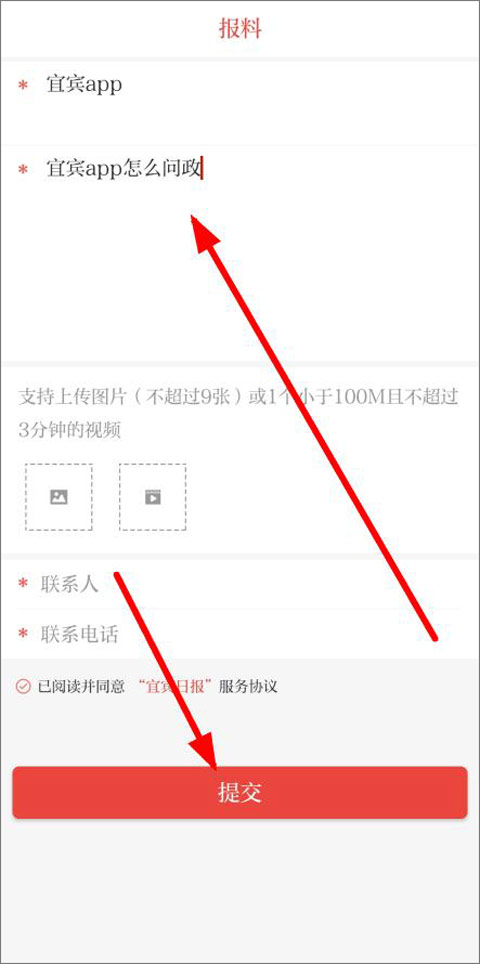 3、进入报料页面,用户需要输入标题、文章内容、图片/视频,填写联系人姓名、电话,点击提交等待审核即可。