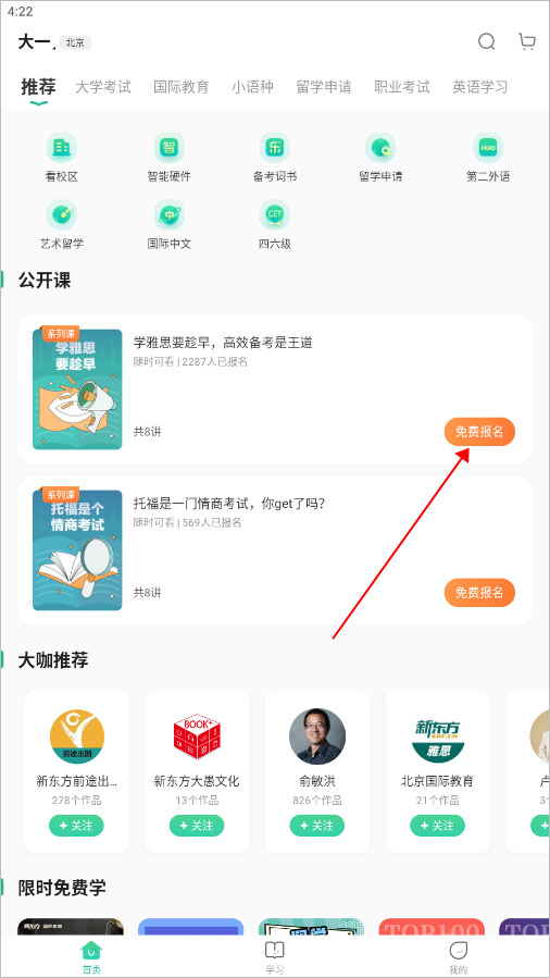 1. 打开新东方app的最新版本,进入首页后,点击你想要报名的课程。