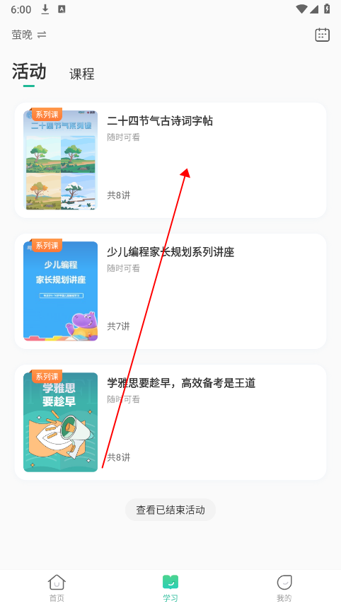 1. 打开软件后,点击屏幕下方的学习选项,接着挑选已完成报名的课程。