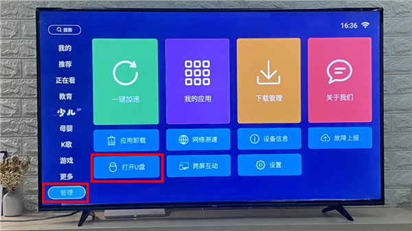 5、由于TCL电视系统的限制,下载好的不会自动安装,需要到【欢视助手】的【管理】里打开【打开U盘】按钮;