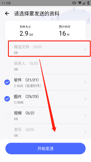 2、点击勾选需要发送的资料,点击【开始发送】。