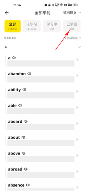 2、进入全部单词页面,切换到已掌握栏目,点击选词重学,选择单词,最后点击重新学习即可。