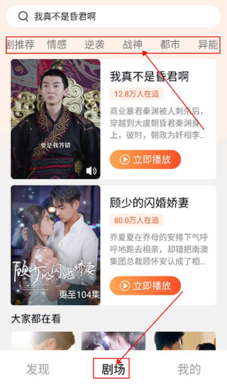 用户还能点击下方的剧场,进入剧场页面,进而在精选、新剧、情感、逆袭等七个分类中,挑选自己心仪的分类进行观看。