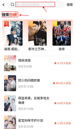 用户既可以在发现页点击右上角的放大镜,也能够在剧场页点击上方的搜索框,这两种方式都能进入搜索页面。进入搜索页面后,用户既能够选择直接搜索自己想要观看的短剧名称,也可以点击搜索热榜内的短剧来进行观看。