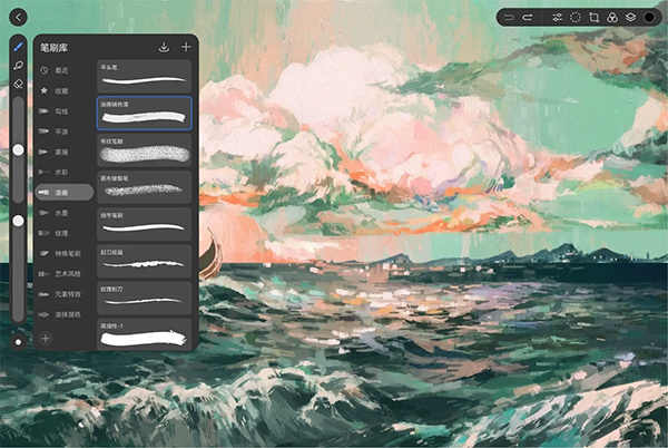 4. 逼真的画布与丰富的预置画笔库相匹配,不管是水墨、油画亦或是水彩,每一笔的晕染都自然且流畅。
