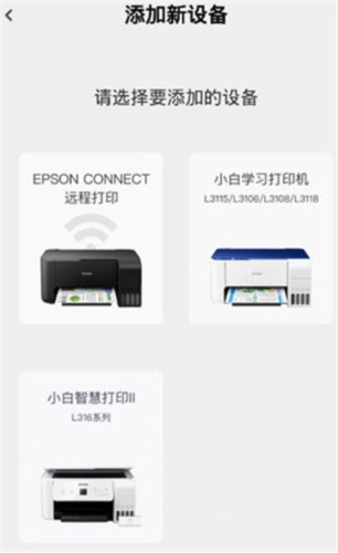 2. 点击【暂无设备,前往绑定】,从中挑选要添加的设备,当前仅支持EPSON、小白学习打印机、小白智慧打印II 。